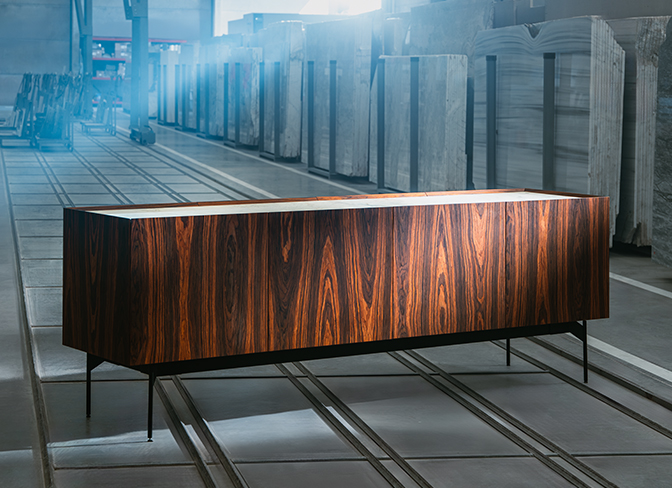 Diferente das linhas de móveis personalizados da Evviva, a Evvai se constrói a partir de peças soltas. Mesas, buffets e elementos de apoio pensados para se relacionar com o espaço de forma autônoma, estabelecendo diálogo com a arquitetura e com os objetos ao redor.